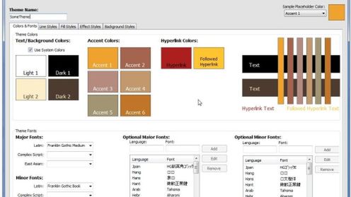 Tworzenie theme'ów odbywa się w pięciu krokach. Na początku w sekcji Colors & Fonts podajemy nazwę theme'u, wybieramy kolory tekstu, hiperlinków, tła oraz rozmiar i wygląd czcionki. W drugim kroku (Line styles) dopasujemy wygląd linii (ich wielkość, położenie, styl), wielokropków itd.