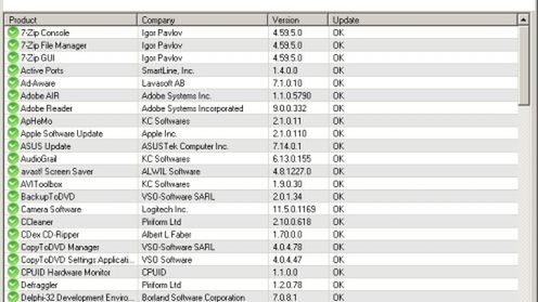 - W oknie aplikacji pojawi się lista, która będzie przedstawiać zainstalowane przez nas programy. Obok każdej pozycji pojawi się jedno z trzech oznaczeń: wykrzyknik na czerwonym tle to kluczowa aktualizacja; żółta gwiazdka oznacza drugorzędną aktualizację, a haczyk na zielonym tle - najnowszą wersję.