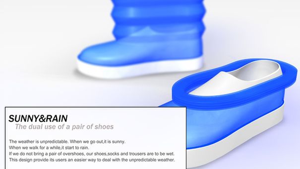 Designer REN Fangying stworzył buty na każdą pogodę. Możemy nosić je zarówno podczas słonecznych dni, jak i w czasie deszczu. W tym drugim przypadku buty zamieniają się w coś w rodzaju kaloszy. Choć nie ukrywam - wygląda to niezbyt ładnie.