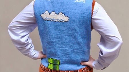 Powyższy sweterek, to prezent pewnej żony (nie ujawniono imion) dla pewnego męża, miłośnika gier. Ciuszek nie został jednak kupiony w sklepie. Kochająca małżonka zrobiła go sama na drutach! Trudność w stworzeniu sweterka nie polegała tylko na odpowiednim układaniu ściegów. Zwróćcie uwagę na odblaskowy kolor zielonych krzaków. Aby uzyskać taki odcień wełny, obrotna kobieta namoczyła białą wełnę w specjalnym barwniku chartreuse.