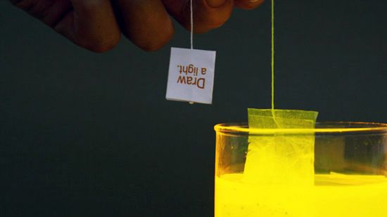 Choć raczej nie nadaje się do picia. To koncepcja koreańskiego projektanta o swojsko brzmiącym imieniu Wonsik Chae. Miał fantastyczny pomysł by w torebce, naśladującej torebkę herbaty ekspresowej umieścić fluorescencyjne cząsteczki, a w szklance związki chemiczne wywołujące reakcję chemiczną powodującą ich świecenie. Naprawdę genialne w swojej prostocie. Choć nie jestem pewien czy łatwe i bezpieczne w realizacji.