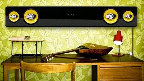 To stylowe „coś” to w istocie cztery, silne głośniki umieszczone na odblaskowej... hmm belce? Po prawej stronie widać też pilot zdalnego sterowania.