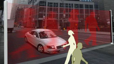 Po obu stronach danego pasa ruchu umiejscowione są dwa specjalne słupy, które za pomocą wbudowanych w nie plazmowych laserów wyświetlają wielki czerwony obraz przedstawiający przechodzących pieszych. Taki obraz oczywiście sygnalizuje, że nie można poza niego wyjechać, bo potencjalnie znajdują się tam piesi. Oczywiście lasery nie są na tyle mocne, by łamiący przepisy samochód został by pozbawiony dachu w ramach kary, ale na pewno działają na wyobraźnię bardziej niż znane nam obecnie rozwiązania.