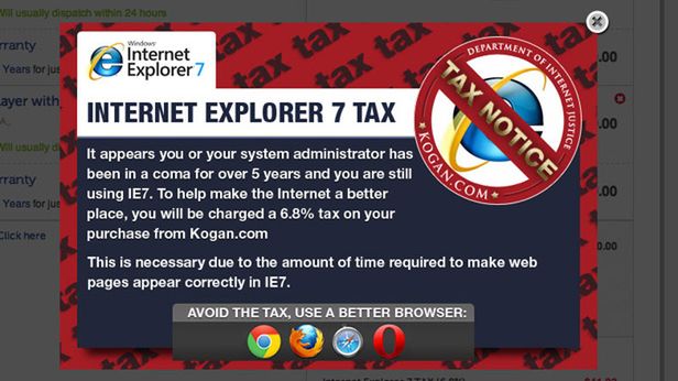 Na przykład IE 7. Wyobrażacie sobie, że gdzieś na świecie ktoś jeszcze używa IE 7, w czasach gdy na wyciągnięcie ręki, za darmo jest przynajmniej kilka świetnych, nowoczesnych przeglądarek? W kraju, gdzie wszystko stoi na głowie, tj. Australii, duży sklep internetowy z elektroniką, Kogan, właśnie ogłosił w blogu, że będzie pobierał specjalną opłatę od użytkowników "antycznej przeglądarki".