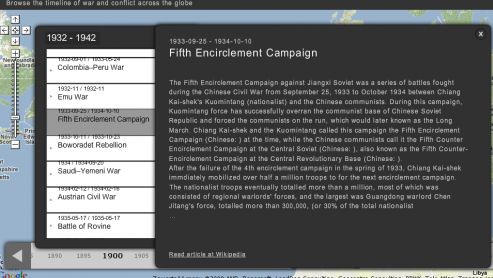 Dodatkowo możemy także na bieżąco pobierać szczegółowe informacje o danym wydarzeniu z angielskojęzycznej Wikipedii. Wystarczy w tym celu zaznaczyć dany konflikt na mapie i kliknąć w literkę "i".