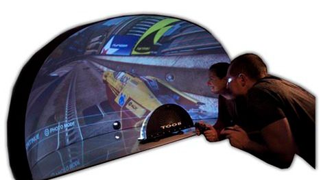 T.O.O.B, bo tak brzmi nazwa prezentowanego ekranu, to pewnego rodzaju sfera, która symulować ma trójwymiarowy, otaczający nas obraz. Najlepiej sprawdza się to chyba we wszelkiego rodzaju grach wyścigowych, co możecie zobaczyć na poniższym filmiku.