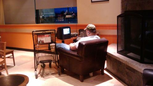 Widoczny na powyższym zdjęciu mężczyzna przyniósł mały telewizor i konsolę Xbox 360 do Starbucksa w Anchorage na Alasce. Jeden z użytkowników Reddita zauważył to i utrwalił na fotografii.