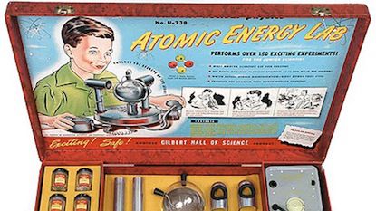 Na zakończenie ciekawostka, która mnie osobiście najbardziej przypadła do gustu, a jednocześnie zaszokowała. W ramach zestawów małego naukowca w 1951 roku wyprodukowano "małe laboratorium energii atomowej" (zdj. na górze wpisu). W jego skład wchodził między innymi licznik Geigera, miniaturowa komora Wilsona (inny rodzaj urządzenia do detekcji promieniowania) oraz ... cztery próbki uranu (!). Poza tym do zestawu dołączony był komiks na temat energii atomowej oraz instrukcja obsługi z formularzem zamówienia na kolejne próbki (tak na wszelki wypadek, jakby stare się skończyły). Rok później z wiadomych względów promieniotwórczą zabawkę wycofano z produkcji.
