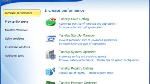 - Ściągamy program i instalujemy go. Po jego odpaleniu zobaczymy, że w menu po lewej stronie mamy kilka opcji do wyboru: **Increase performance, Free up disk space, Maintain Windows, Solve problems, Customize Windows **oraz Additional tools.