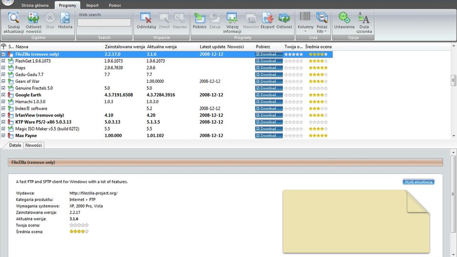 Program nie tylko śledzi wersje zainstalowanych aplikacji ale podaje również link do strony, z której ściągniemy ich najnowsze wydanie. Linki download odnoszą się do strony producenta updatestar gdzie znajduje się opis danego programu i link do jego nowej wersji.