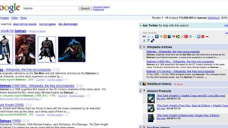 Poza szpiegowaniem nas, WebMynd dodaje kilka bajerów do głównej strony Google: są to boczne panele z wynikami wyszukiwań na takich stronach jak Wikipedia, Amazon, Twitter, Yahoo, Delicious, YouTube itd. Tak też dzięki WebMynd możemy wyszukiwać na raz na kilkudziesięciu stronach. Sprytne.