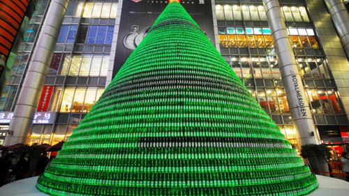 Choinka została zbudowana z 1000 pełnych butelek Heinekena i stoi w Szanghaju.*