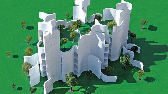 Która bowiem biblioteka na świecie mogłaby się poszczycić dwupoziomowym dachem zamienionym w bujnie rosnący ogród czy umieszczeniem na dachu modułów zbliżonych wyglądem do łopat turbin wiatrowych i obracających się podczas podmuchów wiatru? Na dodatek na dachu, pełniącym rolę zewnętrznego dziedzińca, umieszczone zostałyby zbiorniki na wodę deszczową, bo zaopatrzyć w życiodajną ciecz rośliny zasiedlające ogród.
