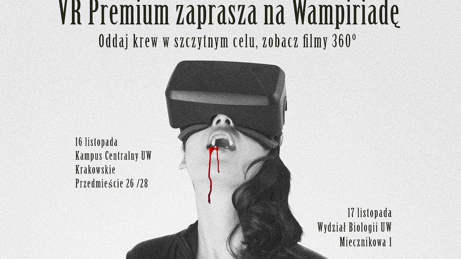 Polskie studio VR Premium weźmie udział w Wampiriadzie - czyli specjalnej zbiórce krwi organizowanej w środowiskach studenckich. Produkcje stworzone na potrzeby wirtualnej rzeczywistości będzie można oglądać 16 listopada na Kampusie Centralnym (Krakowskie Przedmieście 26/28) w godzinach 11:30-14:00 oraz dzień później przy Wydziale Biologii (ul. Miecznikowa 1) w godzinach 9:00-14:00. Ekipa wirtualną rzeczywistość zaprezentuje też na warszawskiej SGH, poznańskim UAM oraz wrocławskim UE, PWr oraz UWr, kiedy tam organizowana będzie Wampiriada.