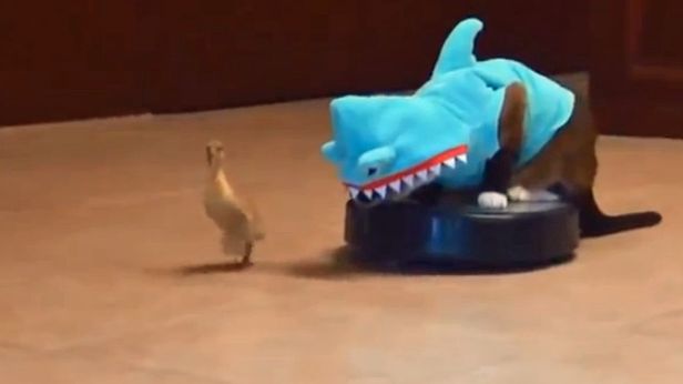 WTF dnia: kot przebrany za rekina goni na roombie kaczkę [wideo]