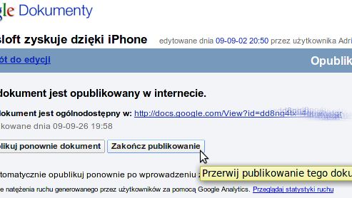 Warto zaznaczyć, że całość dotyczy jedynie dokumentów, które wcześniej udostępnialiśmy. Jeśli wśród takich były te, których nie chciałbyś widzieć w niepowołanych rękach wystarczy prosta procedura. Przechodzimy na stronę danego dokumentu, następnie wyszukujemy przycisk "Udostępnij" a następnie wybieramy "Udostępnij jako stronę internetową" w nowej karcie (widocznej na obrazku na początku wpisu) wybieramy przycisk "Zakończ publikowanie".