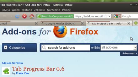 Tab Progress Bar, bo o nim mowa, wyświetla na każdej karcie pasek z informacją o postępie ładowania się danej strony. Instalacja dodatku w przeglądarce przedstawia się standardowo, zatem wystarczy przejść na stronę pluginu, wybrać przycisk "Add to Firefox" i następnie zaakceptować wgrywanie w nowym oknie: