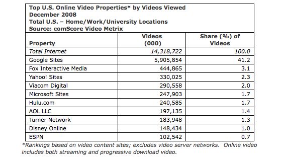 Udało wam się. Jak zwykle prowadził YouTube z 5,9 mld obejrzanych klipów, co stanowiło 41% całego rynku. Zaraz za nim uplasowało się Fox Interactive Media, które w tym obszarze zyskało najwięcej dzięki MySpace. Które osiągnęło prawie 0,5 mld wejść.