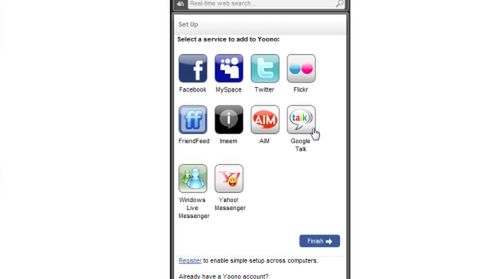 Po zainstalowaniu aplikacji ujrzymy listę serwisów, z którymi współpracuje. Są to: Facebook, MySpace, Twitter, Flickr, FriendFeed, Imeem, AIM. Yoono współpracuje także z Google Talk, Windows Live Messenger oraz Yahoo! Messenger.