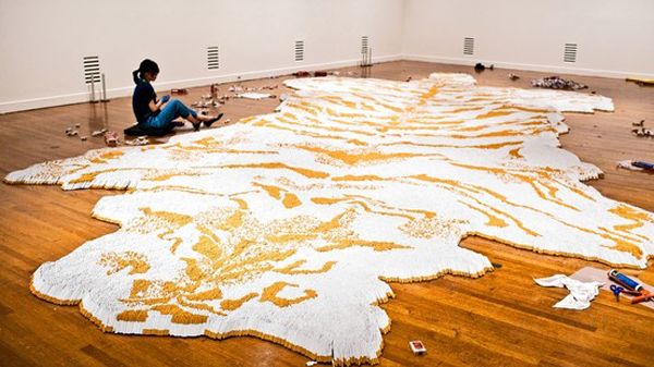 Tygrysia skóra to dzieło znanego chińskiego artysty Xu Binga. Wzór przypominający paski na skórze dzikiego kota został zrobiony z tysięcy papierosów ułożonych w odpowiedni sposób. To już trzecie dzieło tego artysty, które związane jest z papierosami, a cała seria nosi nazwę Tobacco Project.