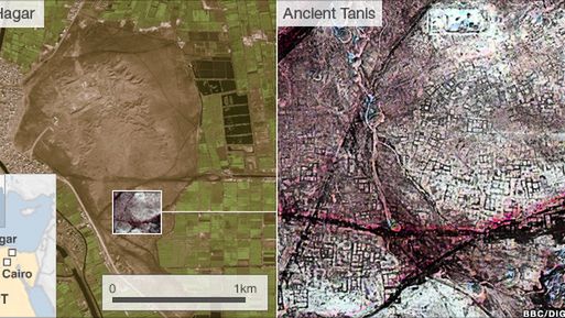 Zdjęcia pokazują obraz starożytnego miasta Tanis, położonego w delcie Nilu nieopodal dzisiejszego San al-Hadżar. To miasto było niegdyś jedną ze stolic starożytnego Egiptu i znaczna jego część wciąż pozostaje zagrzebana pod piaskami. Próbne wykopaliska odkryły mury domu sprzed 3 tysięcy lat, których kształt prawie idealnie odpowiadał temu, co udało się uchwycić dzięki satelicie.