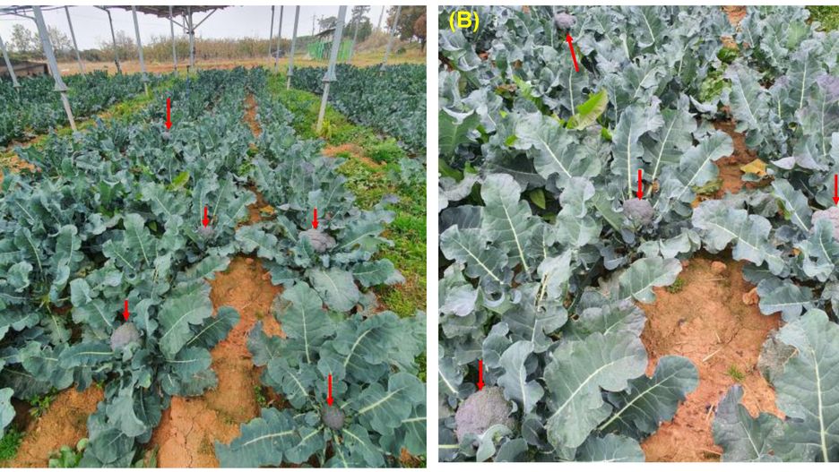 Powyższa fotografia prezentuje porównanie brokułów rosnących pod instalacją fotowoltaiczną (lewa strona), do tych, które rosły pod gołym niebem (prawa strona). Widać, że rośliny po lewej są bardziej zielone.