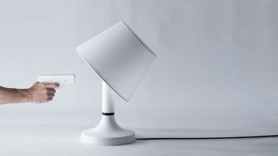 Specjalny pistolet służy do zdalnego gaszenia światła. Bierzemy go w dłoń, kierujemy na lampkę, wciskamy przycisk i już zapada błoga ciemność. Mało tego - klosz lampki drży tak, jakby naprawdę trafiła w niego kula! Pokazuje to poniższy schemat. Jak na razie powstała jedna sztuka tej lampki, ale pomysł jest udany i z pewnością znajdzie się producent całej serii.