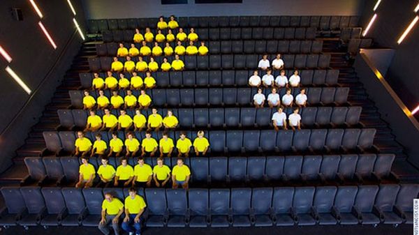 Tym razem tłem wydarzeń jest sala kinowa. 111 osób ubranych w różnokolorowe koszulki odtworzyło jedną z wielu gonitw, jakie w swoim wirtualnym życiu odbył Pac-Man. Pomysłodawcą jest Guillaume Reymond. Poniższy filmik to już piąte dzieło tego zapaleńca z serii GAME OVER Project.
