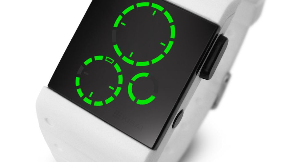 Zegarek wygląda jak część jakiegoś panelu kontrolnego i - kto wie - może kiedyś znajdzie w takim zastosowanie. Póki co przeznaczony jest do noszenia na nadgarstku. Jeden krąg prezentuje godziny, drugi pokazuje cykl 4-minutowy, a trzeci... cykl 5 minut, tak więc do szybkiego odczytywania godziny trzeba nieco praktyki. Który krąg jest do czego - nie zdradzam, pogłówkujcie sami.