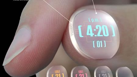 Zegarki mogą być dostępne w różnych kolorach i gdy nieaktywne są prawie niewidoczne. Aż dziwne, że ten pomysł nie wygrał całego konkursu, jest bardzo interesujacy i efektowy. Ciekawe czy łatwo byłoby zamienić tą koncepcję w rzeczywistość. Na wakacyjne wypady jak znalazł. A na wieczornym party na plaży w Łebie z miejsca 100 punktów do lansu. ;)