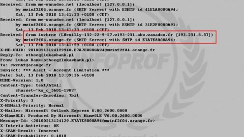 Jeśli zajrzymy do źródła maila również nie znajdziemy w nim adresu serwera poczty polskiego banku – jak się okazuje mail przywędrował do nas rzeczywiście z Francji, wykonując tam co najmniej dwa skoki po serwerach wanadoo.net i orange.fr .
