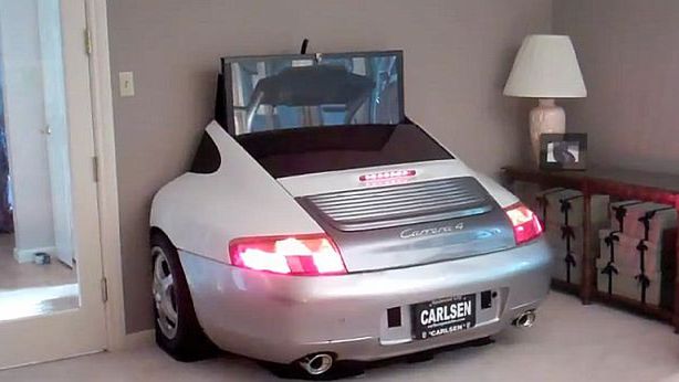 Temat estetyki takiego "mebla" może zostawmy bez komentarza. Na pierwszy rzut oka stojak wygląda jak porsche 996 wbite w ścianę salonu. Realizmu dodaje fakt, że całość wykonana jest z oryginalnych części porsche, od elementów karoserii po koła z tarczami hamulcowymi.