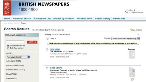 Z podobną sytuacją mamy do czynienia w przypadku British Newspapers, która zawiera artykuły pochodzące z brytyjskich gazet, wydawanych w latach 1800-1900. Zbiór jest naprawdę imponujący, bo obejmuje ponad 2 miliony tytułów. Szkoda, że za dostęp trzeba zapłacić - darmowe jest tylko wyszukiwanie artykułów, które mogą nam pomóc w zorientowaniu się, czy warto skorzystać z oferty tej strony.