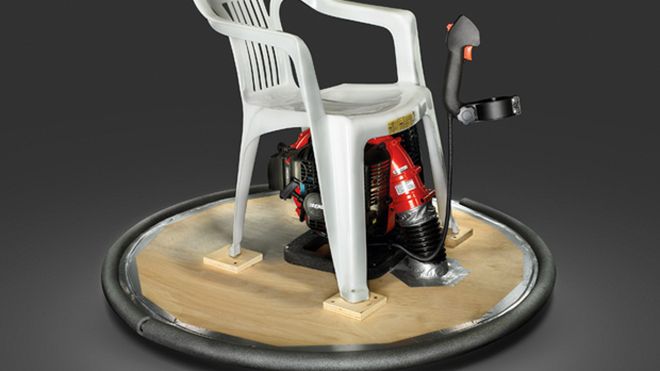 Teraz wystarczy jedynie przymocować do sklejki siedzenie i można ruszać w drogę. Pamiętajcie, że jeśli przyjdzie Wam do głowy rzeczywiście coś takiego konstruować robicie to na własną odpowiedzialność. Przez nieuwagę możecie skończyć jak pewien amatorski konstruktor.