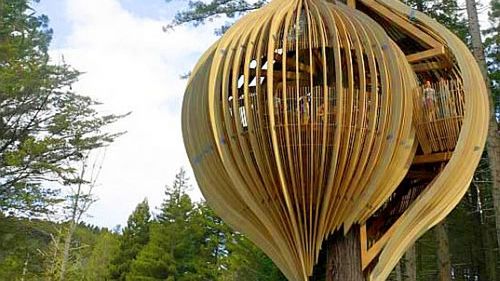 Na drzewa przenosi się nie tylko życie rodzinne lecz i towarzyskie. Na zdjęciu widzicie Yellow Threehouse Restaurant z Nowej Zelandii. Restauracja powstała jako demonstracja możliwości współistnienia architektury i natury. Inspiracją kształtu widzianego z zewnątrz stał się oprzęd zwyczajnej poczwarki motyla, zaś wejście do lokalu i jego wnętrze zaprojektowano na wzór komór muszli.